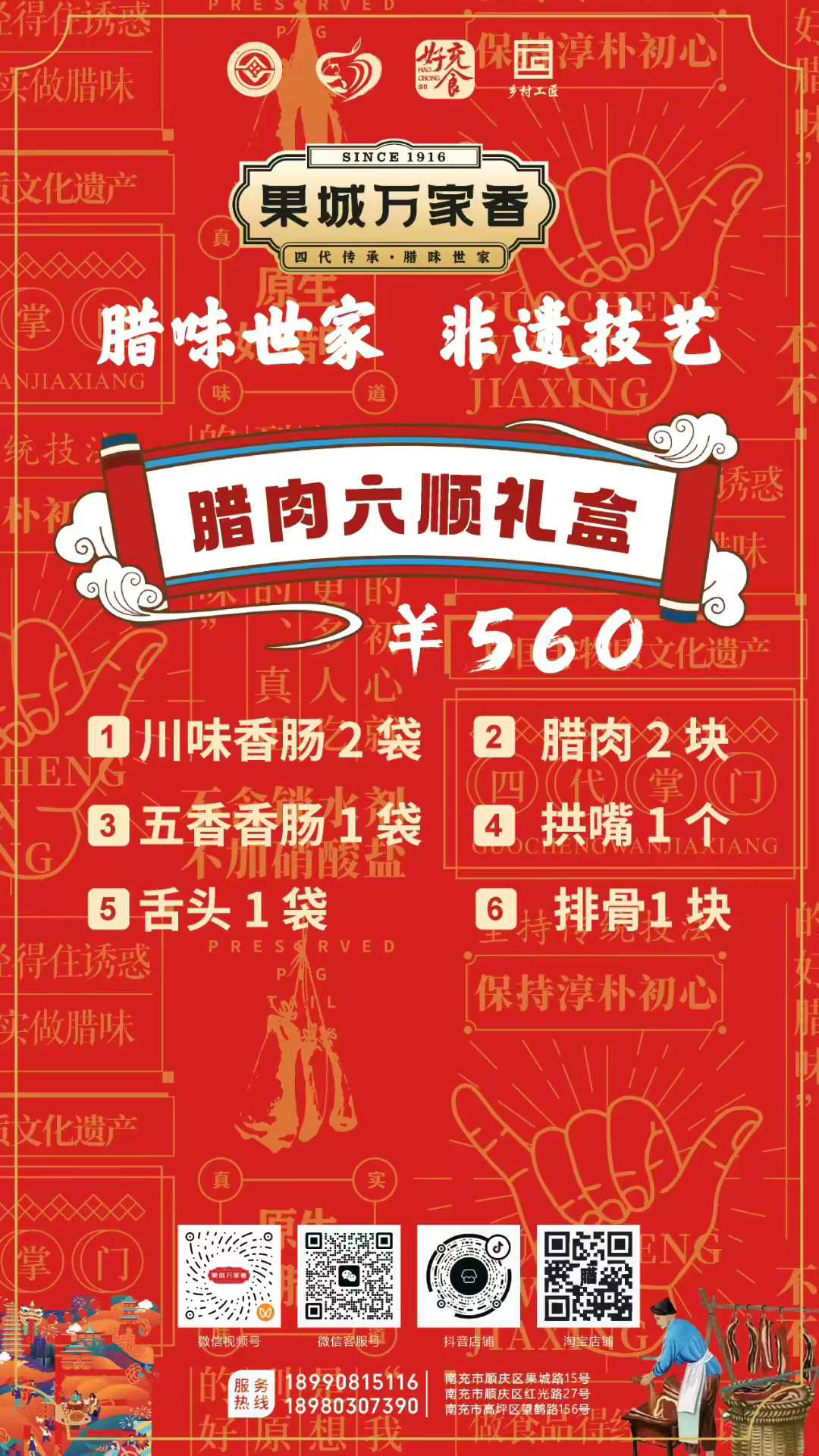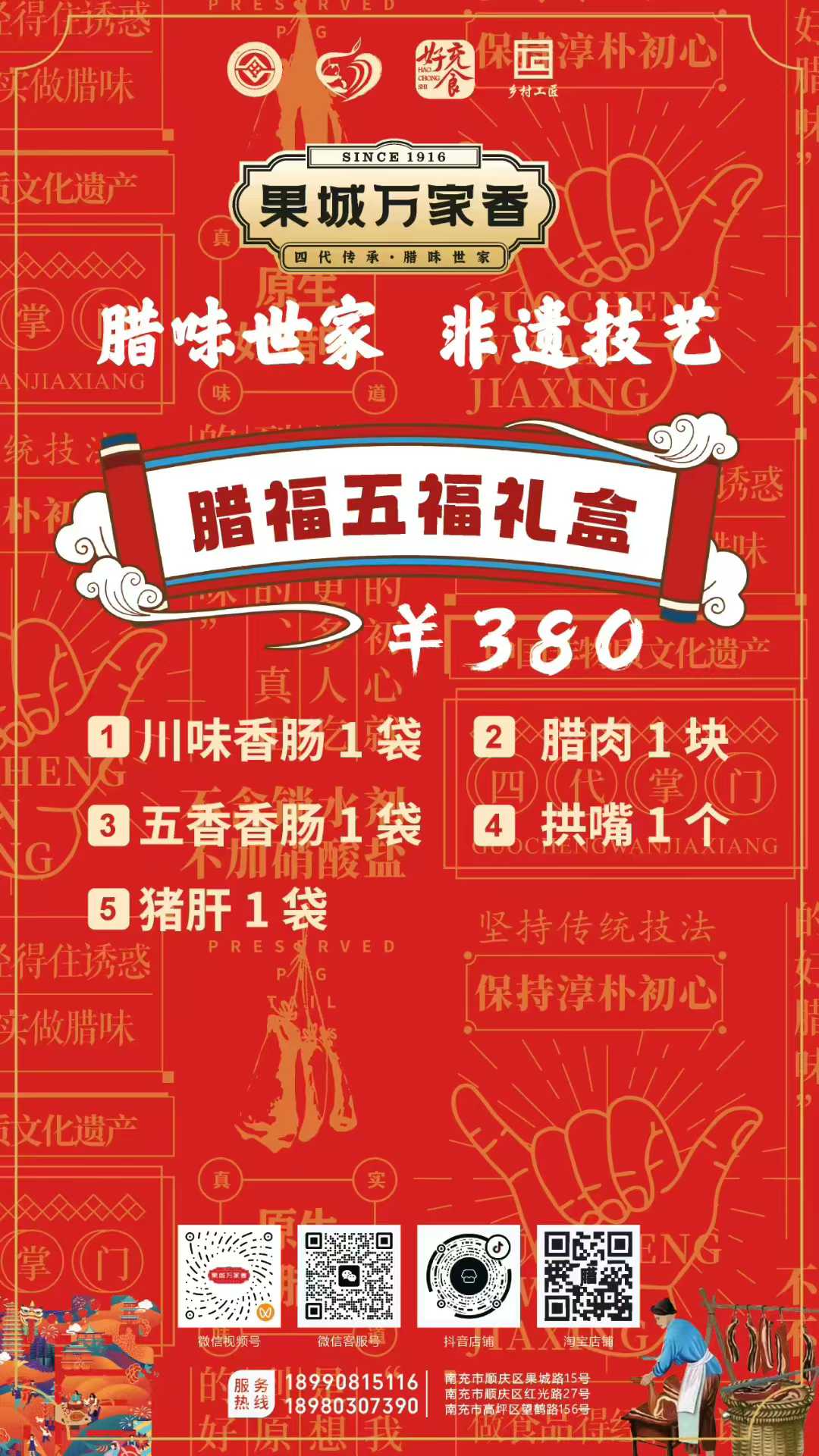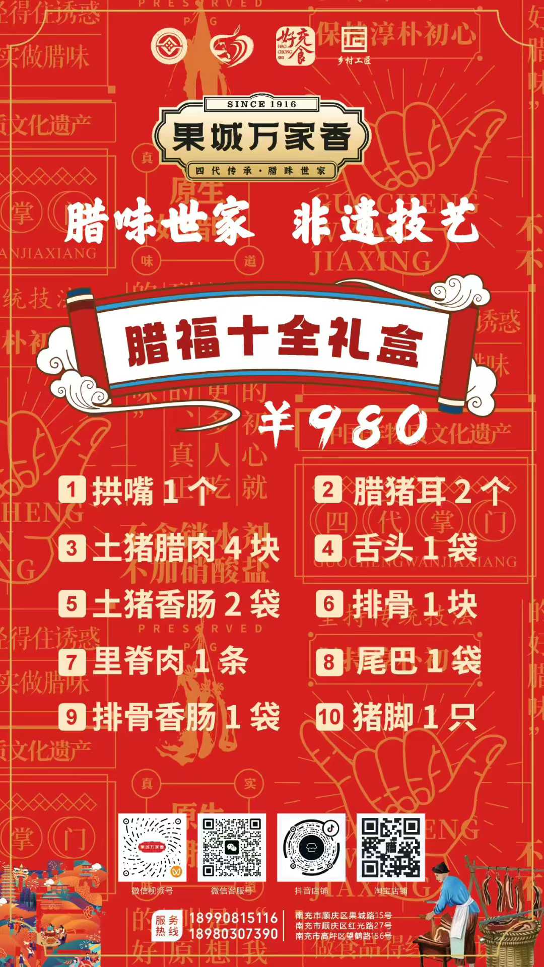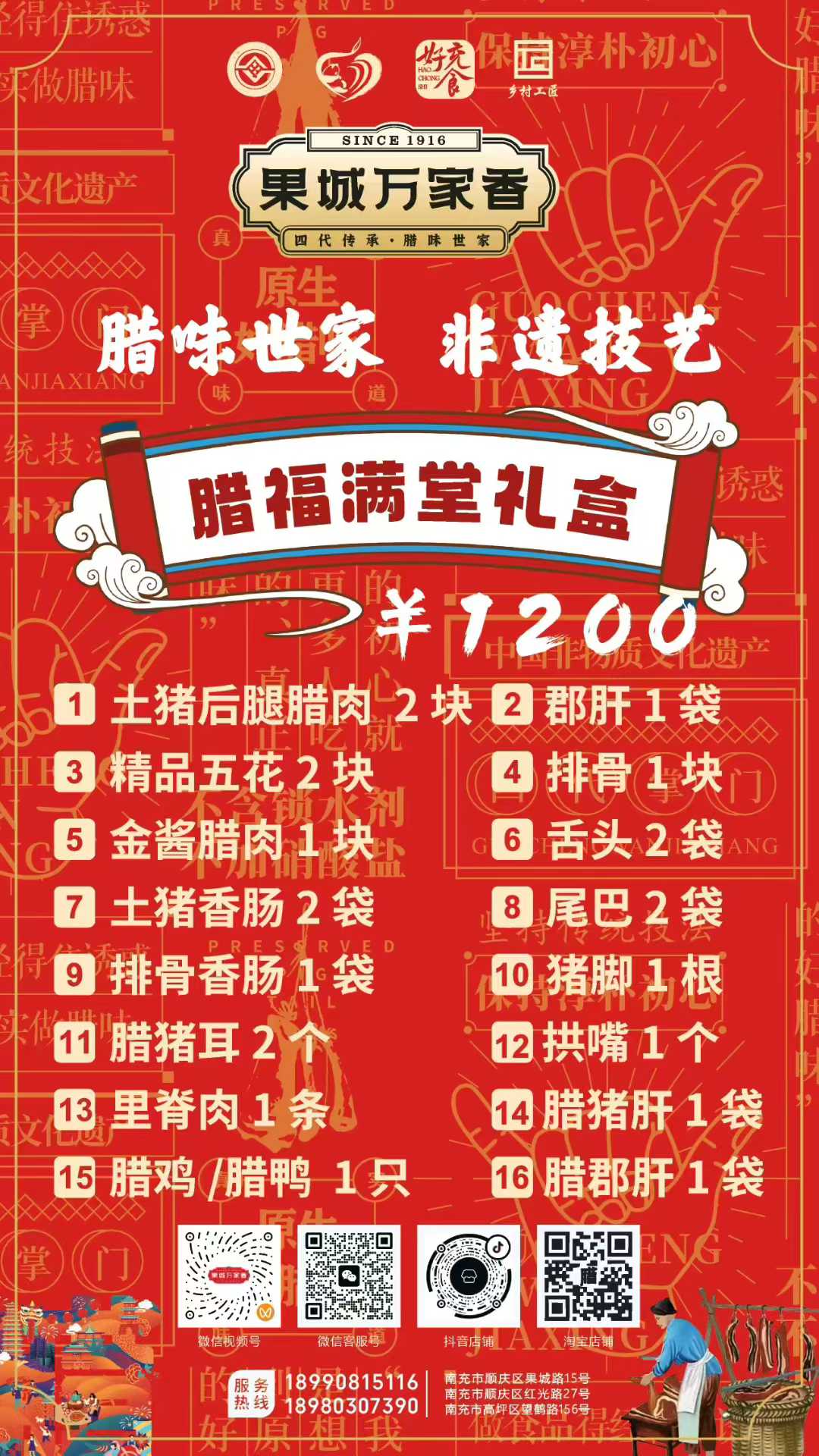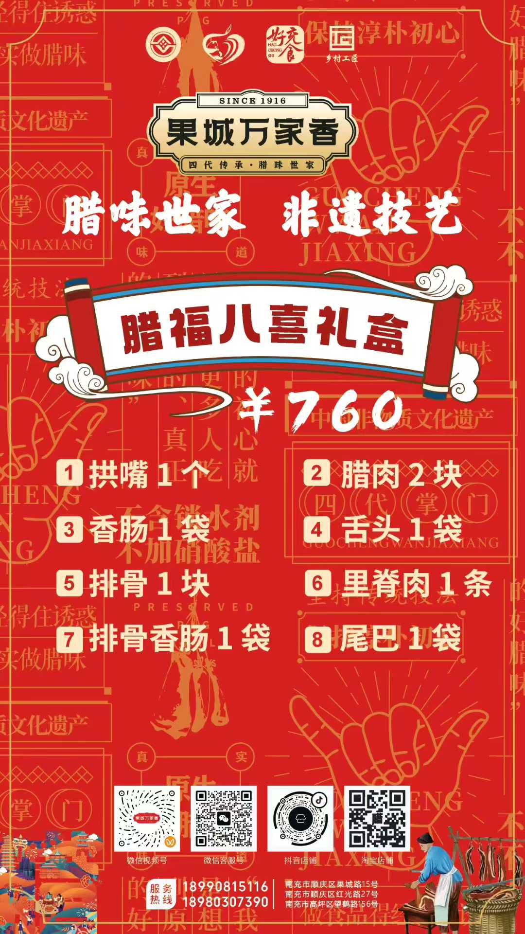 為滿(mǎn)足消費(fèi)者多樣化的節(jié)日需求,萬(wàn)家香特別推出了臘福五福、臘肉六順、臘福八吉、臘福十全、臘福滿(mǎn)堂等多款禮盒,從380元到1200元不等,涵蓋臘肉、香腸、拱嘴、豬耳等十余種臘味單品,無(wú)論是家庭團(tuán)聚還是走親訪友,都能找到稱(chēng)心之選。